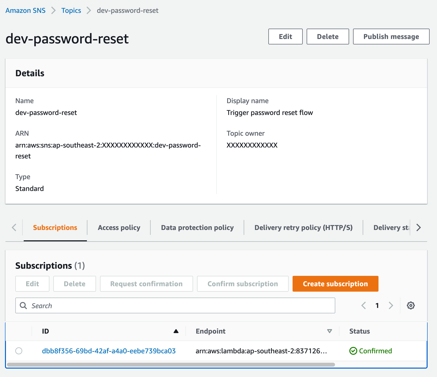 In addition, we need an SNS topic to trigger a password reset email, when the user wants to reset their account password.